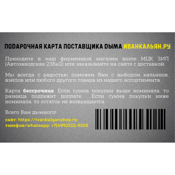 Купите Сертификат номиналом 10000 руб. по цене 10 000 руб. с доставкой в Ханты-Мансийск от сети кальянных магазинов ИванКальян.РУ.