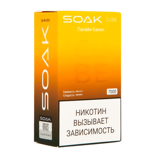 Купите Soak Cube Папайя Банан 7000 Затяжек по цене 1 790 руб. с доставкой в Ханты-Мансийск от сети кальянных магазинов ИванКальян.РУ.